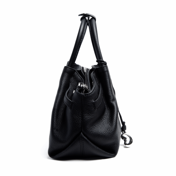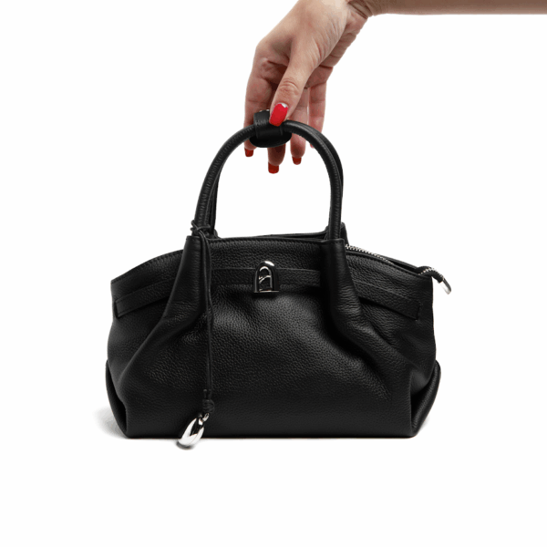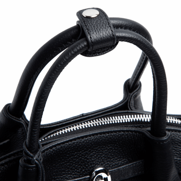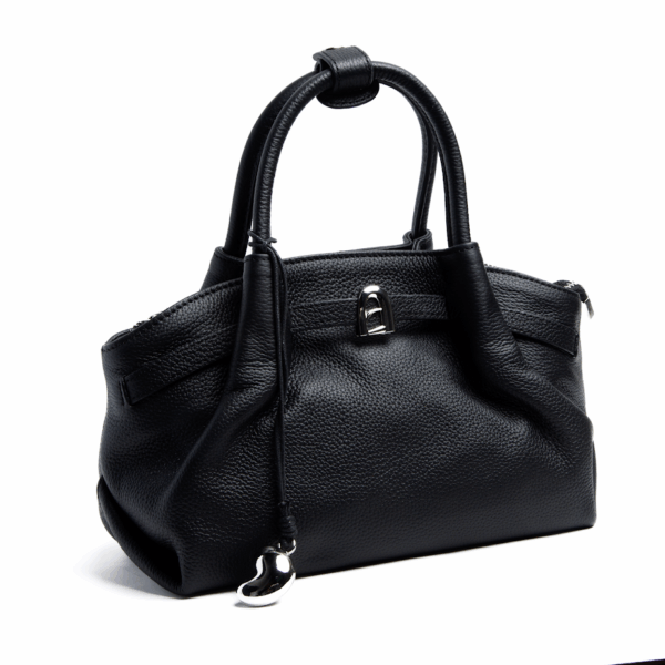 Жіноча шкіряна сумка прямокутної форми чорного кольору – стильний аксесуар для сучасних образів. Міцна натуральна шкіра гарантує довговічність. Сумка закривається на блискавку, всередині достатньо місця для всіх необхідних речей. Лаконічний дизайн із декоративними пряжками додає елегантності та підкреслює стриманий стиль. Ідеально підходить як для ділового гардероба, так і для повсякденних луків.