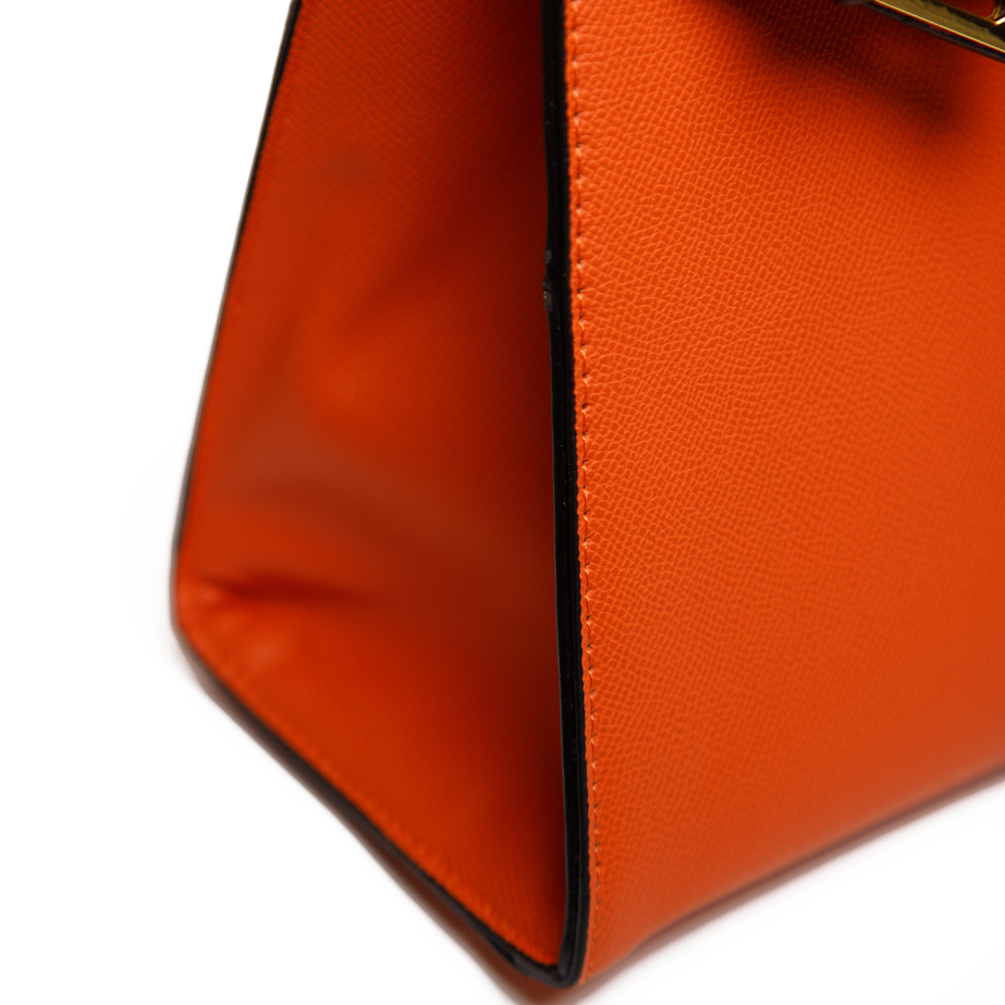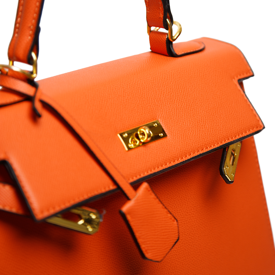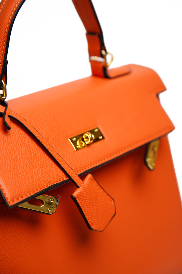 Жіноча сумка з екошкіри помаранчевого кольору — стильний акцент, який освіжить ваш гардероб і додасть образу характеру. Лаконічна форма та стриманий золотистий декор гармонійно поєднуються як з діловими луками, так і з повсякденними образами з джинсами чи сукнями. Щільна екошкіра добре тримає форму, а зручна ручка дозволяє комфортно носити сумку протягом дня. Насичений помаранчевий відтінок виглядає сучасно та легко комбінується з базовими кольорами гардероба. Така жіноча сумка вже кілька сезонів залишається актуальною, тому стане стильним доповненням на кожен день і для особливих подій.