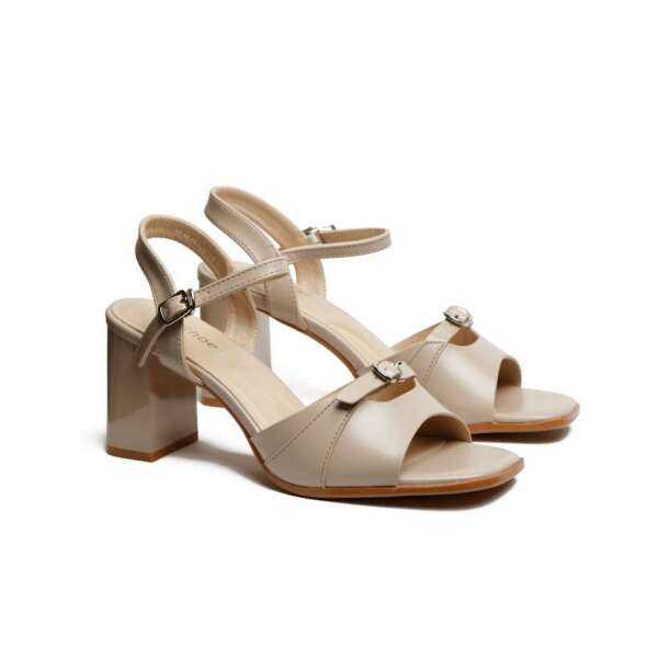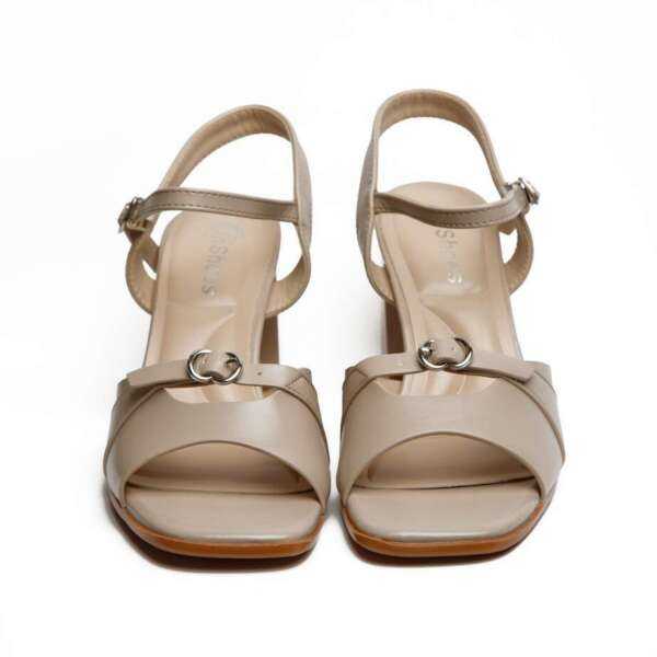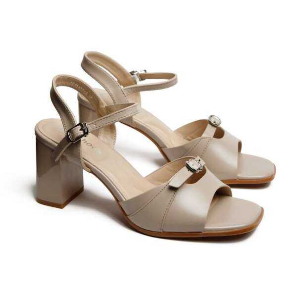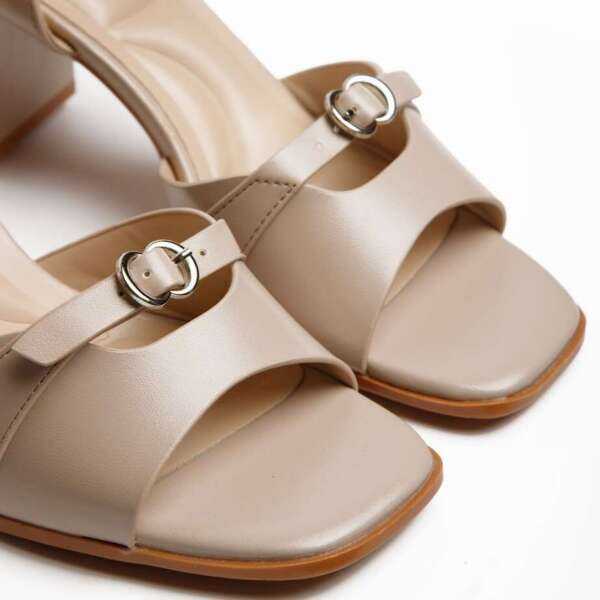 - Жіночі Босоніжки Бежевого Кольору з Екошкіри на Стійкому Каблуці