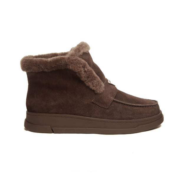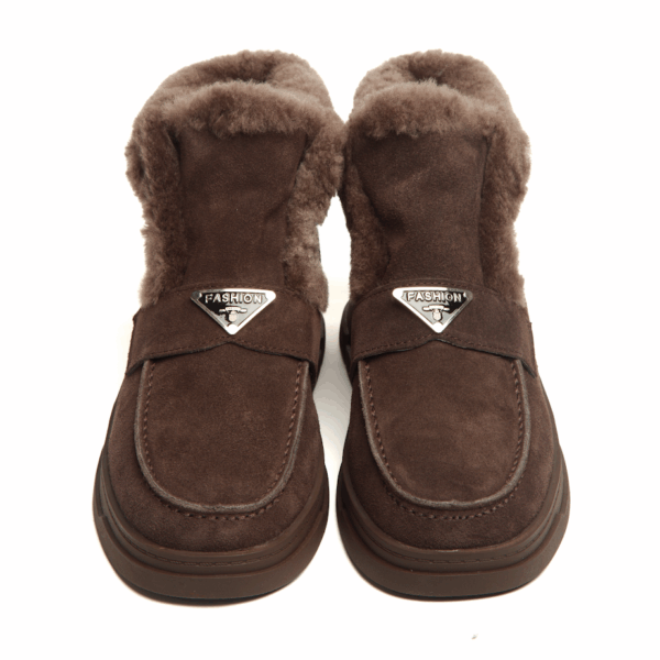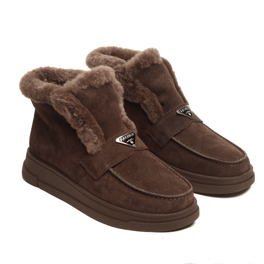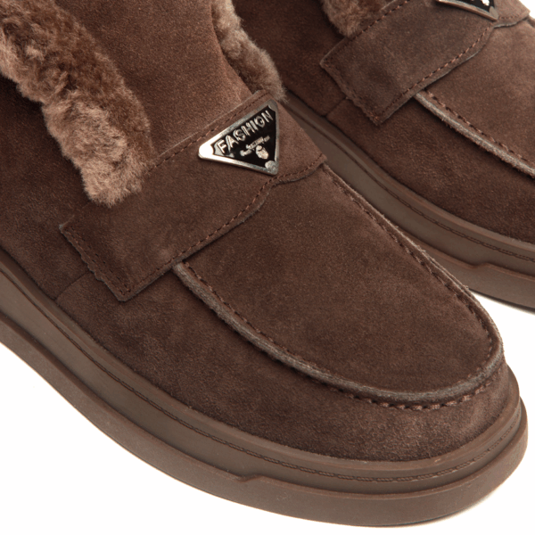 Ці жіночі зимові черевики з натуральної замші — справжній мастхев сезону. Глибокий шоколадний відтінок підкреслює елегантність і додає шарму будь-якому образу — від oversize-пальта до пуховика чи шуби-тедді. Стильна металева деталь із логотипом додає взуттю характеру та впізнаваності бренду.