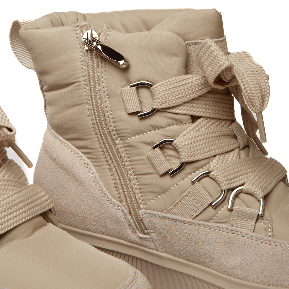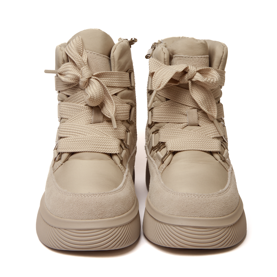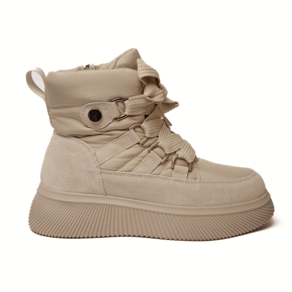 Зимові бежеві черевики з замші та плащівки INSHOES створені, щоб захистити від морозу та снігу в холодний сезон. Їхній ніжний відтінок бежевого легко вписується у будь-який зимовий гардероб. М’яка натуральна замша виглядає дорого та приємна на дотик, а всередині — тепла підкладка з натуральної шерсті, що дбає про комфорт навіть у мороз. Широкі шнурівки додають акценту і поєднують в собі зручність під час одягання. Міцна рифлена підошва забезпечує стійкість і впевненість під час ходьби, навіть на слизьких поверхнях. Такі черевики INSHOES — точно захистять вас від холоду взимку.