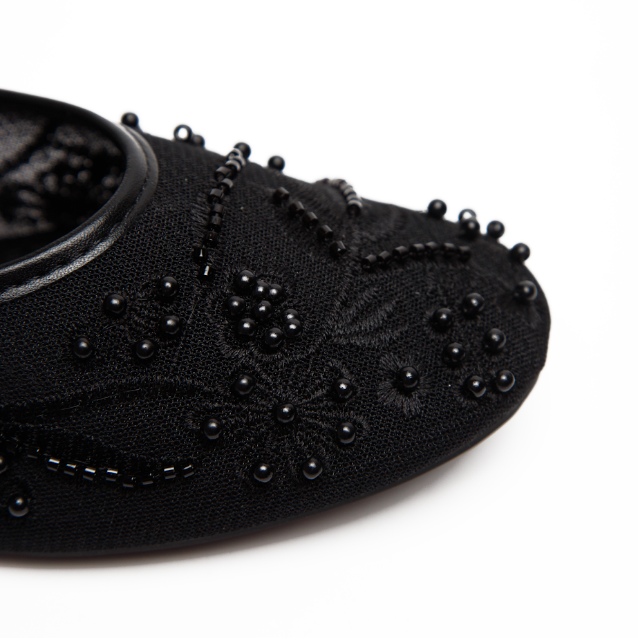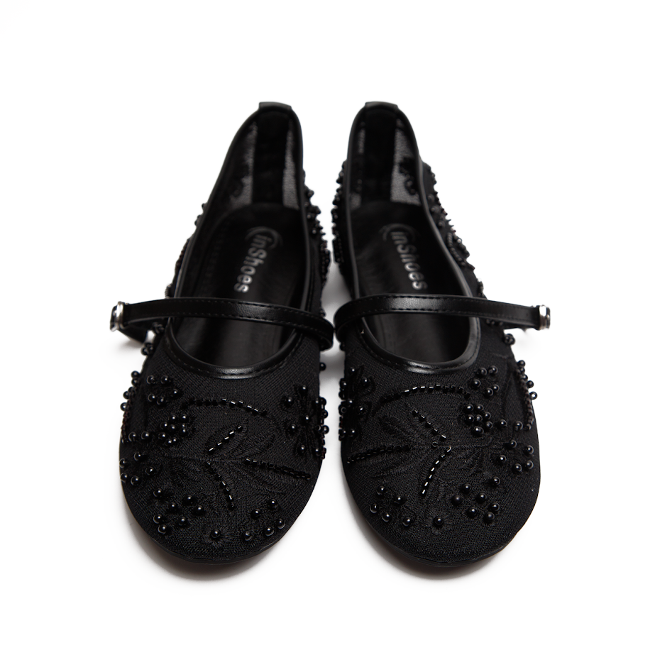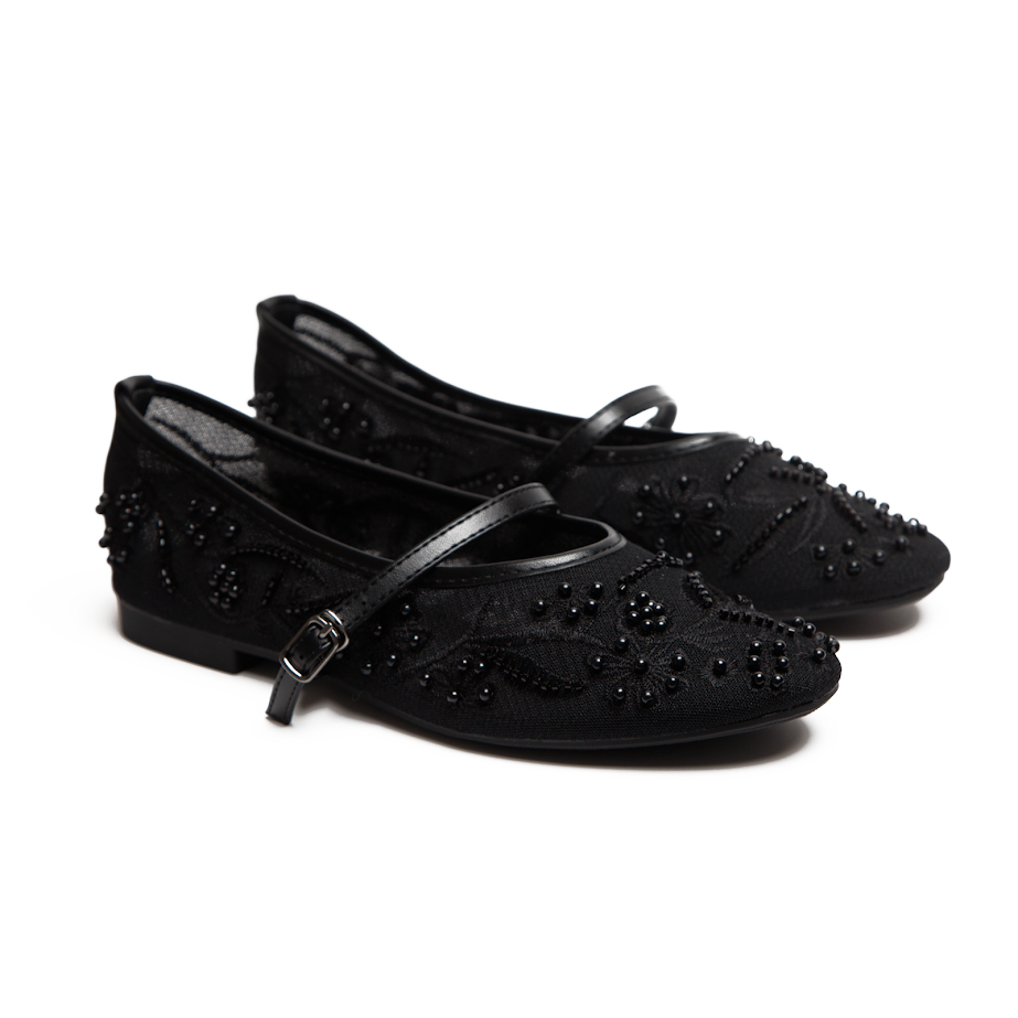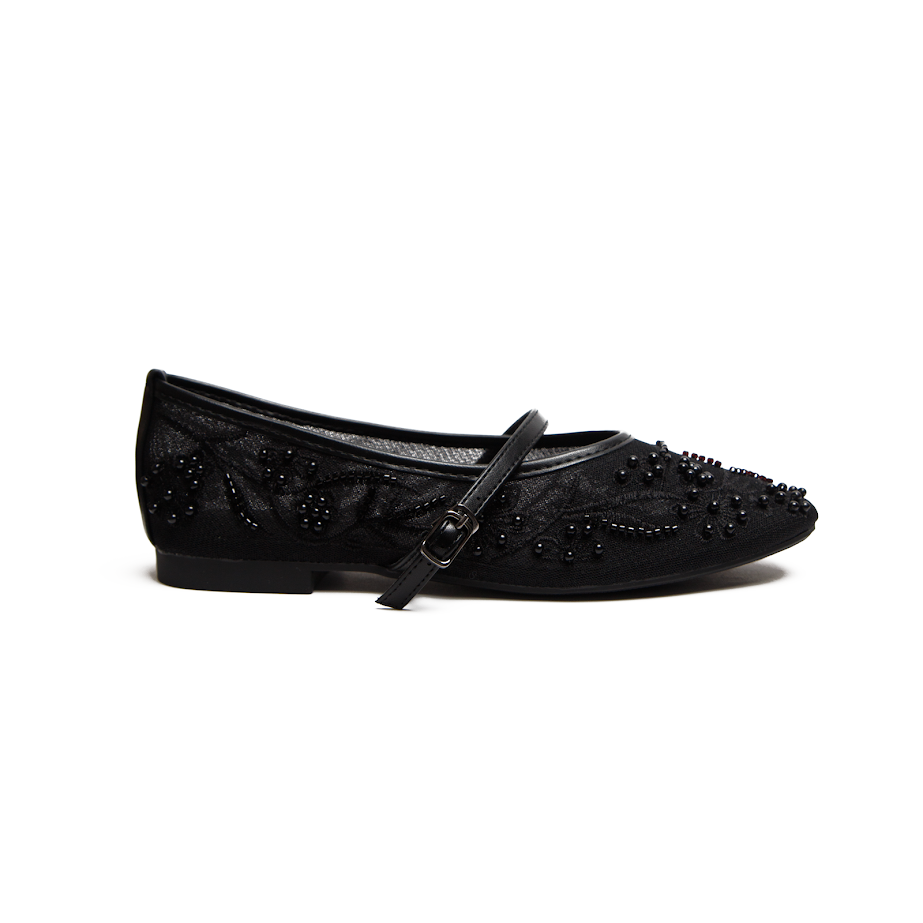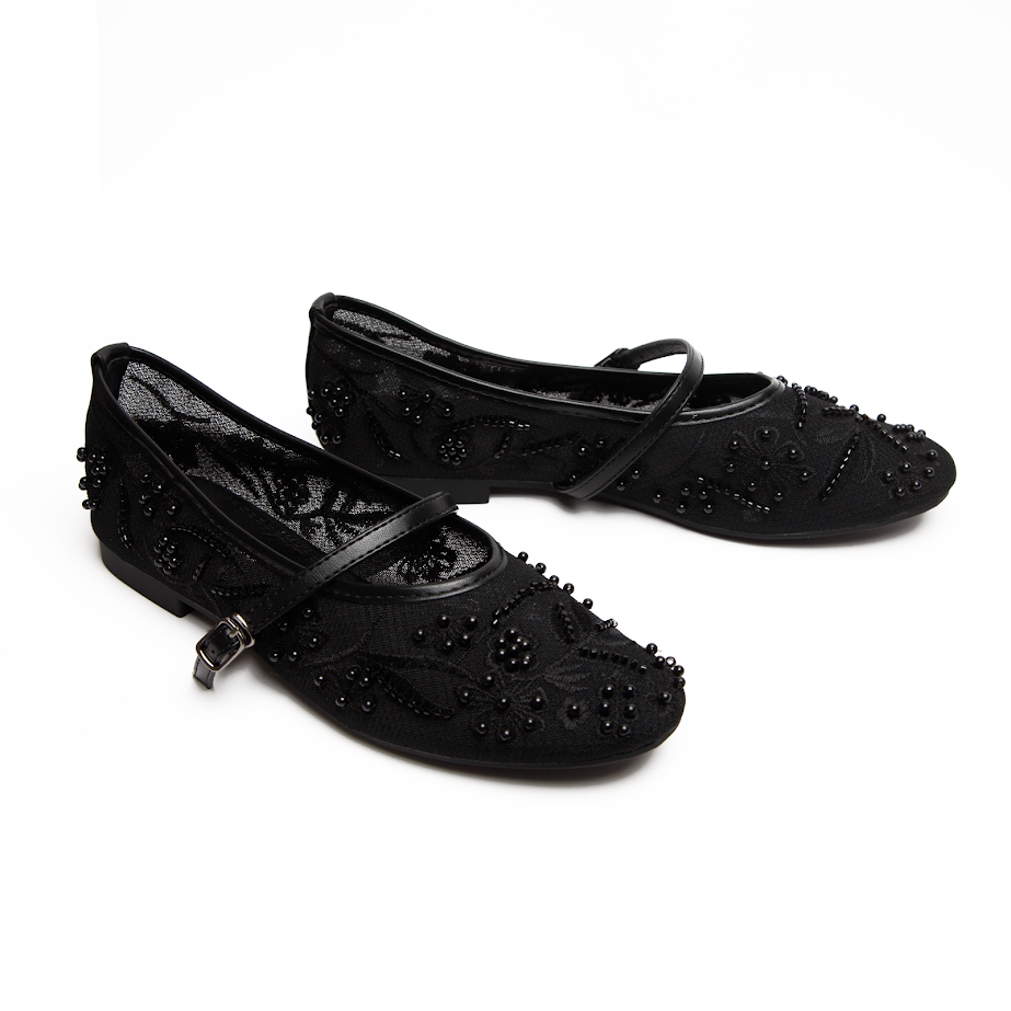 Чорні мереживні балетки з перлинами — втілення ніжності та вишуканого стилю. Прозора сітчаста основа з невагомим квітковим візерунком та розсипом сяючих перлин додає образу романтичного шарму, роблячи цю пару головним акцентом вечірнього чи святкового аутфіту. Тонкий регульований ремінець Мері Джейн гарантує надійну фіксацію стопи, а м’яка конструкція та плоска підошва дарують комфорт протягом усього дня. Ці ошатні балетки легко комбінуються з весільними чи коктейльними сукнями, легкими спідницями та навіть базовими джинсами, підкреслюючи вашу жіночність та бездоганний смак.