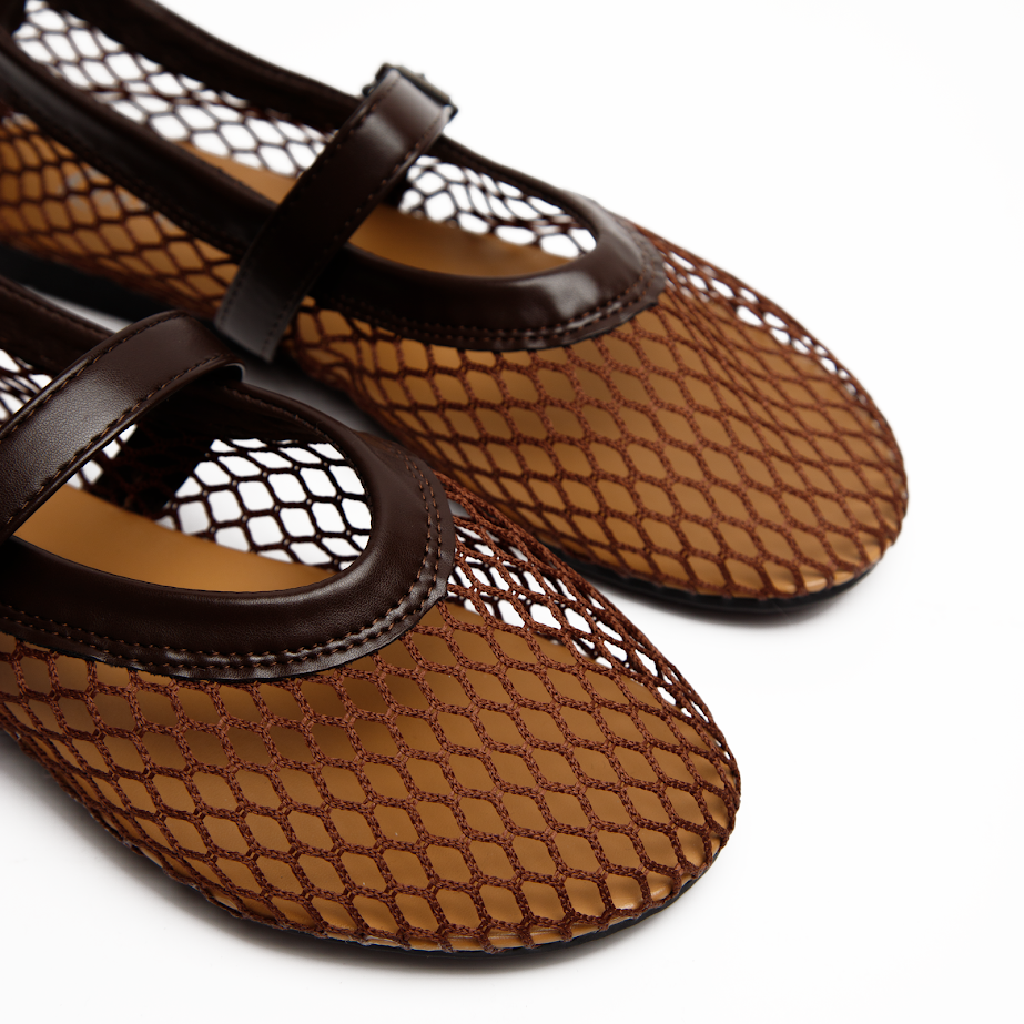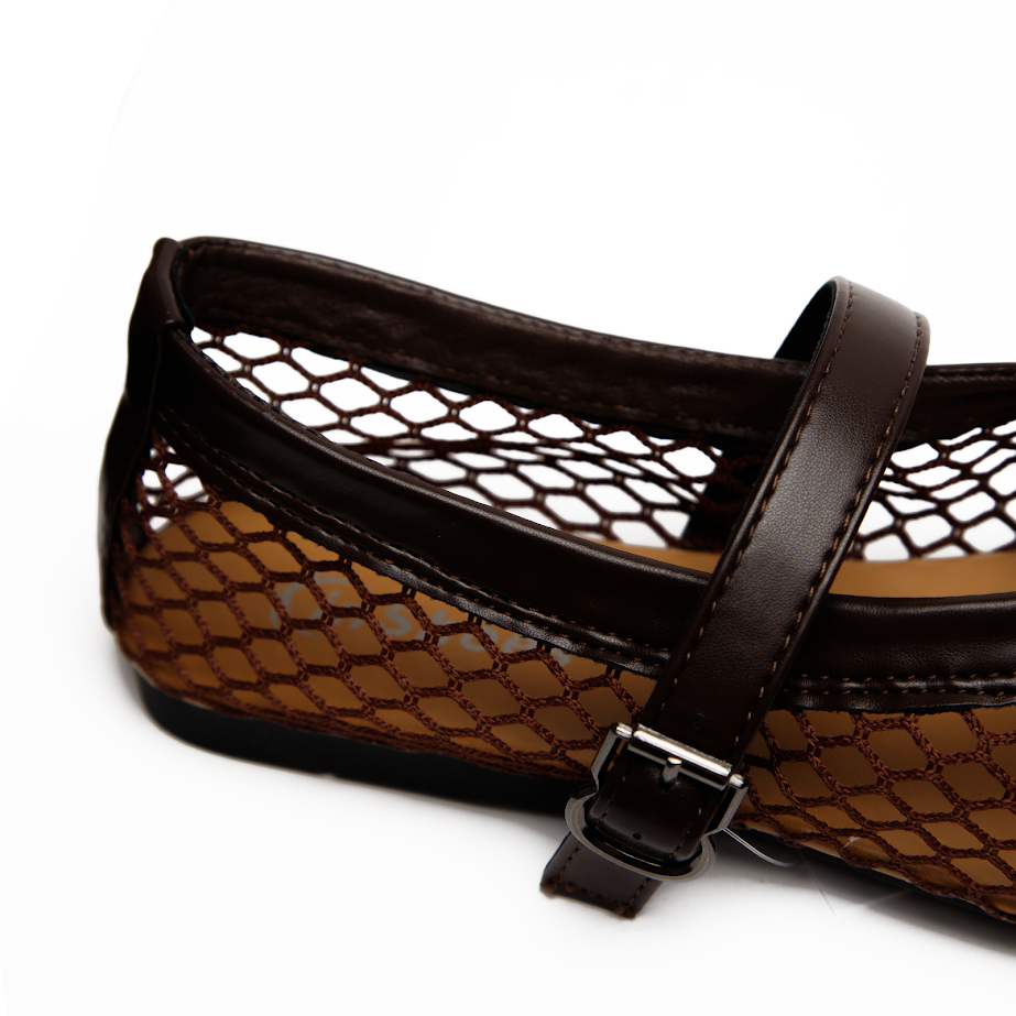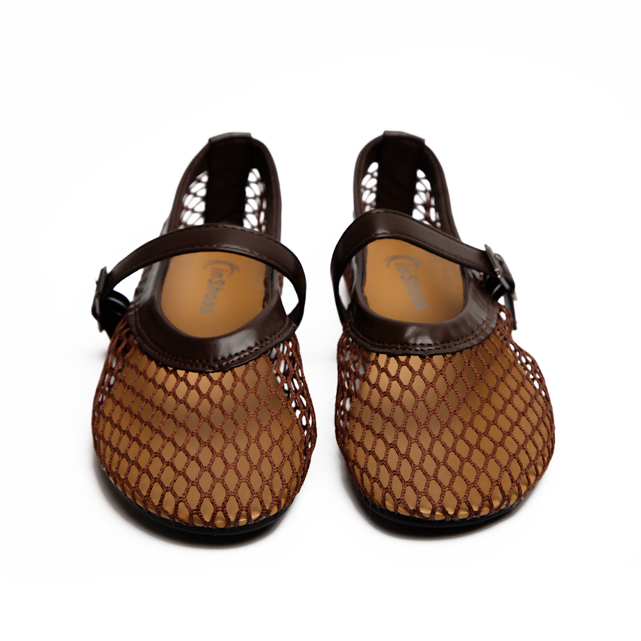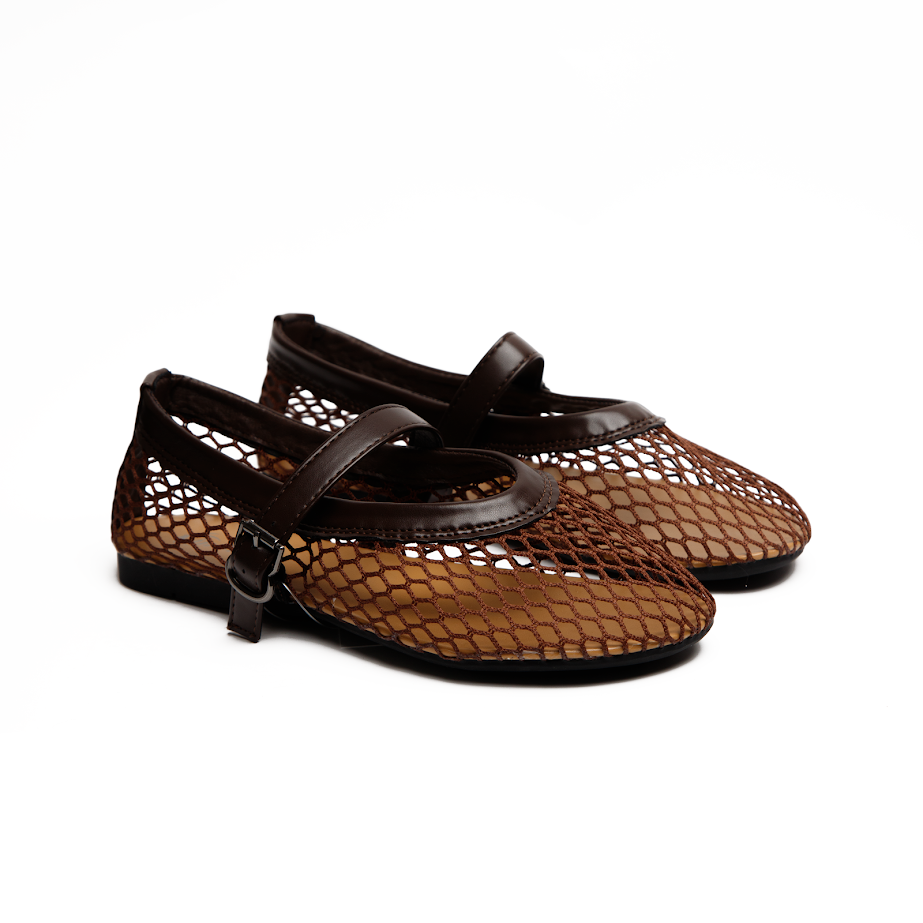 Коричневі сітчасті балетки в стилі Мері Джейн — це втілення трендової естетики та літнього комфорту. Головний акцент моделі — невагомий сітчастий верх, який дарує бездоганну вентиляцію та легкість кожному кроку, створюючи стильний ефект «голої» ноги. Витонченість дизайну підкреслює лаконічний ремінець на підйомі з регульованою пряжкою, що забезпечує надійну фіксацію та комфортну посадку. Теплий коричневий відтінок робить ці балетки Мері Джейн універсальною парою, яка гармонійно доповнить розслаблені лляні сети, легкі сукні або базові джинси, додаючи образу нотку невимушеного шику. Плоска підошва та м’яка конструкція дозволяють насолоджуватися тривалими прогулянками протягом усього дня.
